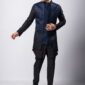 Navy Blue Embroidered Linen Satin Nehru Jacket Set For Men