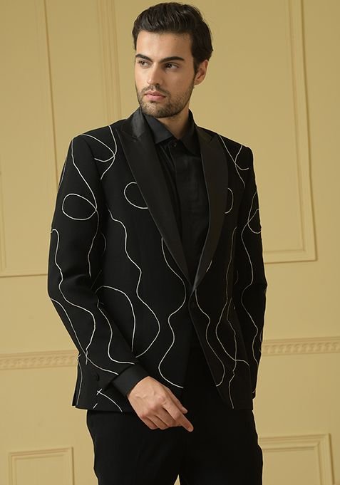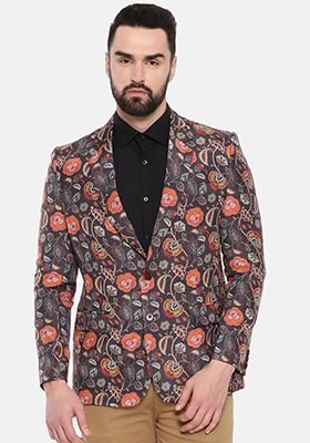 Black Two Button Printed Cotton Blazer For Men