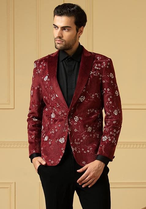 Maroon Embroidered Velvet Blazer Set For Men