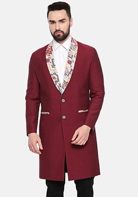 Red Printed Long Trench Coat For Men