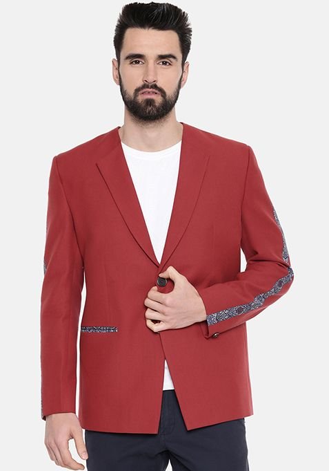 Red Printed Cotton Blazer For Men