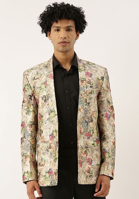Beige Floral Print Open Jacket For Men